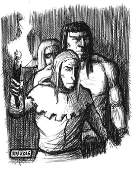 Dagsljuset från öppningen når knappt hit så Botulw tänder en fackla. Trapporna är smala och de måste gå på rad. Efter fyra avsatser kommer de ner till trappans fot. Framför dem ligger graven, svart, kall och fuktig. Det är så tyst att Botulw tycker att det dånar i hans öron. Hans fackla kastar ett vacklande ljus över gråa stenväggar. Tilindil stryker sin alvhuva bakåt så att han kan höra bättre. Alven går först, med en fackla i handen och svärdet draget. Han följs av Block, med svärdet redo. Sen kommer Irmelin som är irriterad över att hon inte kan se förbi Blocks massiva ryggtavla. Sist går Botulw med ytterligare en fackla.