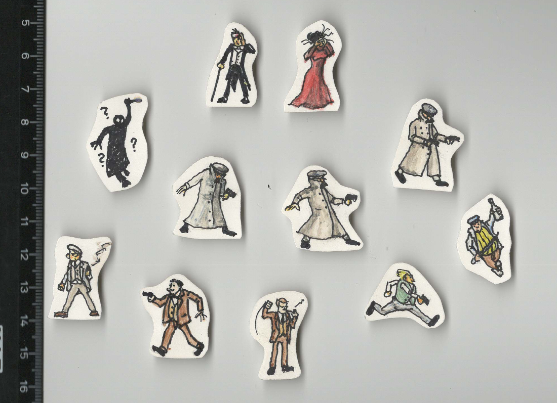 Sommaren 2000 (2001?) fick jag den ljusa idén att göra spelpjäser till ett rollspel jag och kusinerna brukar spela. Pjäserna skulle ersätta de mynt, suddgummibitar och småstenar som vi brukade använda för att markera var personerna stod någonstans. Som kanske kan utläsas av pjäserna utspelar sig spelet i Norden vid 1800-talets slut, är cthulhuinfluerat men mer skämtsamt. Först gjorde jag pjäserna till det äventyr jag skulle spelleda: Överst ser ni Champagnemiljardären duTronc och hans vackra hustru som på sin bröllopsresa i Sverige kidnappas av de fruktade anarkistbröderna Kåre (”De kalla Kårarna”). Underst syns de ”hjältar” kusinerna kunde välja mellan.”Herr Enigma”/frågeteckenmannen hade ingen roll i äventyret, men det är nog han som egentligen var skurken i hela den här historien. Det var han som sådde ett första tankefrö om att såna här spelpjäser skulle kunna användas för mer än bara precis det äventyr som jag satt och förberedde…