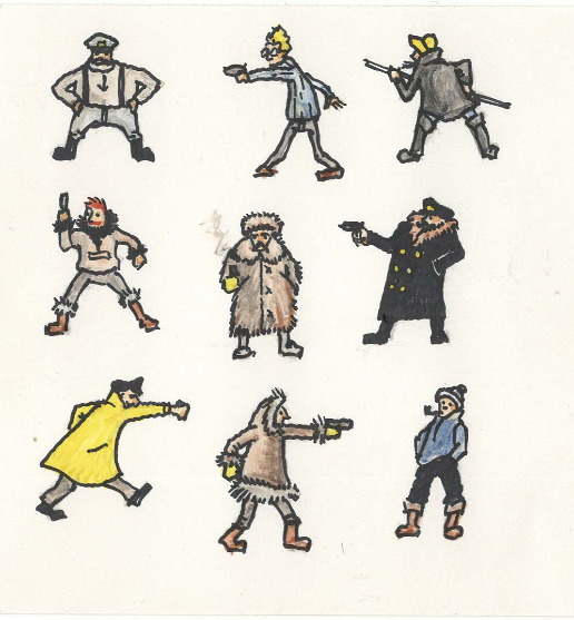 Sen slog den till, sommar-hybrisen. Utan att ha prövat om dessa pjäser egentligen var en bra idé för spelet så passade jag på, då inspirationen var framme och ångan på topp, att göra ett antal mer generiska pjäser. Detta var ju en så uppenbart bra idé att det var lika bra att göra pjäser även för äventyr som ännu inte var skrivna. Det skulle bli användbart för oss alla. Ja, en vacker dag skulle kusinerna komma att tacka mig för denna insats! Det blev många tiotals pjäser med beväpnad allmoge (överst i denna post) men också ett marint tema med medföljande Nordpolsfarare (några syns nedan). En sak som slår mig idag är att med undantag för allmogepjäserna (som var ca 50/50) så tecknade jag nästan bara män. Säger nog något om hur vi spelade och vilka vi under uppväxten stött på som spelade.