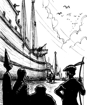 De första tre dagarna till havs går bra, men spänningen mellan äventyrare och besättning stiger. Äventyrarna bidrar inte till arbetet ombord, de äter medhavd – bättre- mat än besättningen och kapten Krooder vägrar avslöja fartygets destination. Till slut, på morgonen den fjärde dagen, brister det. Kocken Bolto slevar slafsgryta över Theo, hårda ord växlas, Theo slafsar tillbaka, slag växlas – Theo golvas av kockens slev. Eliana stiger in och däckar kocken. Nu kan det gå riktigt illa för nu är blankvapen dragna, men Kapten Krooder går rytande emellan och lovar både besättning och äventyrare att han ska mata djupens fasor med alla som använder sitt vapen. Grupperna skiljs muttrande åt och kapten Krooder tackar gudarna för att det strax därefter blåser upp. En vindil blåser bort den pamflett Botulw höll på att läsa, sedan går solen i moln och de första regnstänken kommer. Under de följande två dagarna kryssar Havstulpanen vidare genom hög sjögång och ingen har tid att vara irriterad på någon annan.