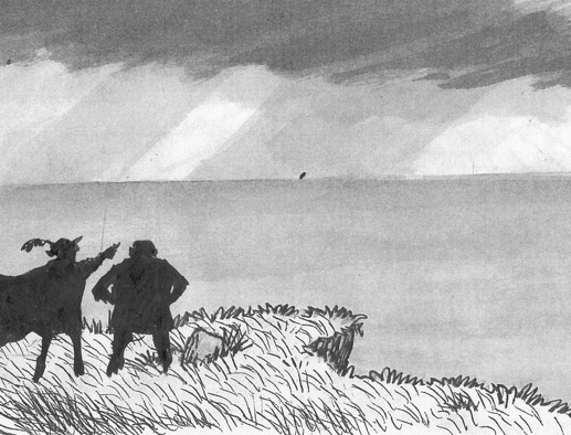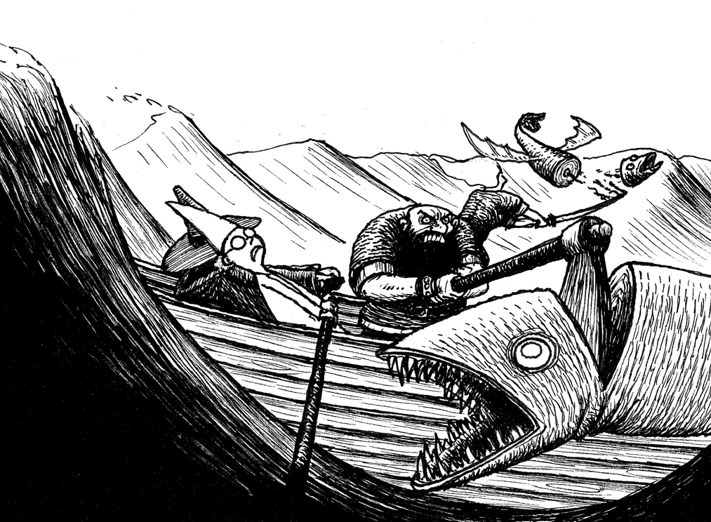 Andfådda av klättringen ser de ut över havet och de regntunga skyarna. De kan inte undvika en känsla av att vara övergivna då de ser Havstulpanen försvinna vid horisonten. Men Krooder är nöjd: -”Bra! Trilgar tar henne utom synhåll. Hör här! För några år sedan rundade jag ön och om jag minns rätt så finns det en delvis raserad borg på norra udden. Det borde vara där trollkarlarna bosatt sig. Jag föreslår…” Vodomar hyssjar: -”Hör ni?” Han tecknar åt de övriga att försiktigt kika ner i öppningen de kom upp genom. Där nere pågår nu en hektisk aktivitet. Piskade av orcher kämpar svartalfer vid årorna i tre illa medfarna skeppsbåtar. De bogserar in ett fartyg samma väg som äventyrarna kom. Krooder drar efter andan: -”Sjögurkan! Kapten Bimers skepp! Då vet vi i alla fall vilka piraterna var.” Svartalferna och orcherna surrar skeppet vid stora klippblock varefter de klättrar ombord och börjar lasta av. –”De kommer se vår skeppsbåt.” Säger Vodomar. –”Bäst att vi inte är här när de gör det.” De beger sig norrut.