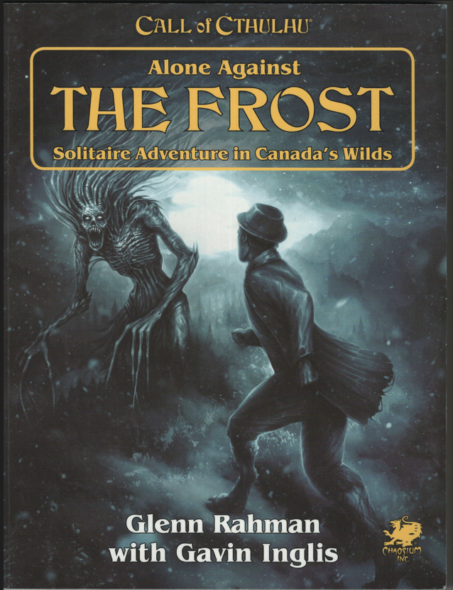 Det har tagit lång tid att få tummen ur för att skriva det här inlägget. Det tråkar helt enkelt ut mig. Mitt tredje försök med soloböcker för Call of Cthulhu, Alone Against the Frost, var inte någon höjdare. Det kan vara så att jag inte gav boken en ärlig chans, men jag tror att grundproblemet är att dessa soloböcker inte passar mig. Att det saknas möjlighet att göra berättelsen till sin egen, att man kan inte tillföra någonting från sin egen fantasi gör att jag tappar intresset. Solospel med Mythic engagerar min fantasi och håller mig på tårna, men det här blir något jag bara ska läsa mig igenom. Detta blir därför den tredje och sista recensionen av Alone Against … (även om det finns fler).