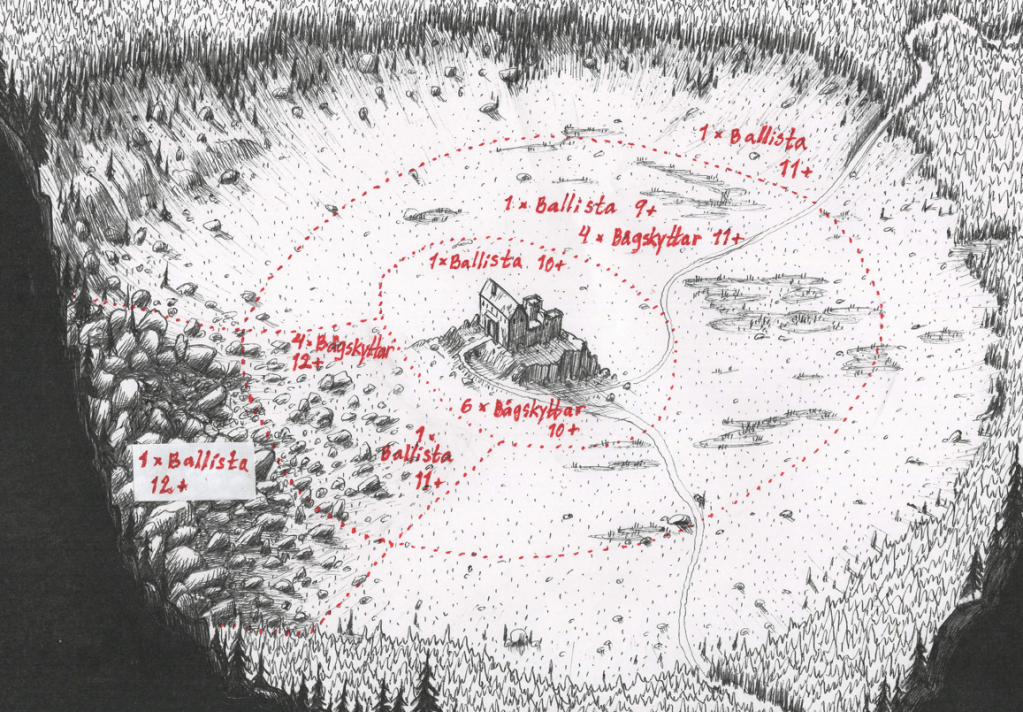 Kartan visar hur många skott av bågar och ballistan försvararna hinner få iväg mot anfallare medan de passerar zonen. Ju närmare borgen, desto fler bågskyttar kan nå dem. Siffrorna 9+, 10+ ,11+, 12+ visar vad rövarna behöver rulla med 2T6 för att träffa angriparna