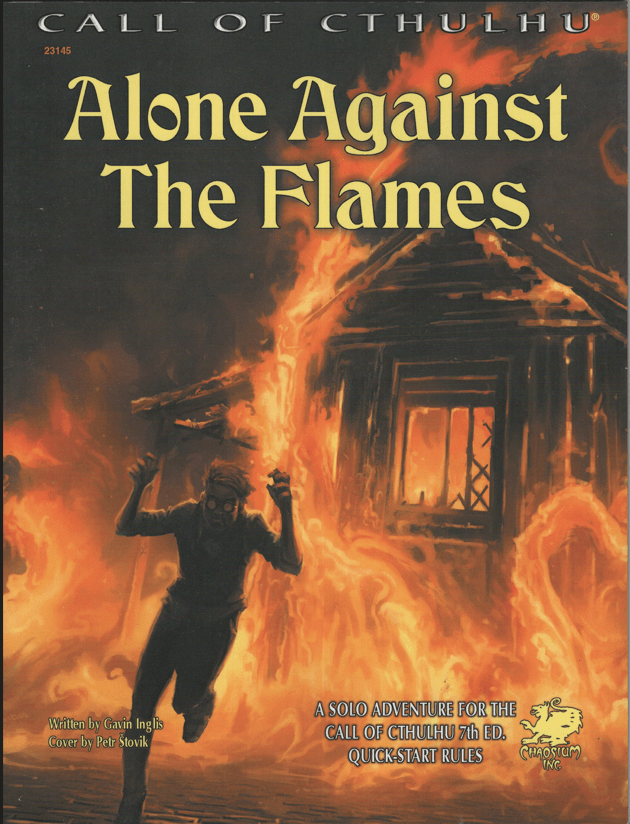Om man inte spelat Call of Cthulhu, eller inte har någon att spela med, rekommenderar jag ett köp av Alone Against the Flames. Gavin Inglis text är klart bättre än genomsnittet i genren. Det är en bra introduktion både regelmässigt (gillar verkligen att man inte behöver ha läst reglerna alls för att börja spela) och temamässigt (en kult som tillber någon form av väsen från stjärnorna).