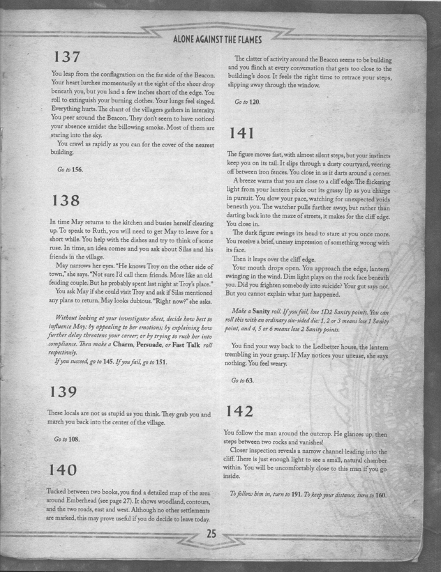 Att försöka få det att se ut som att man läser en gammal bok är också lite poänglöst eftersom gamla böcker inte är fyllda av ”paragrafer”. Eller (meta-meta) är det känslan av att vi läser en gammal solorollspelsbok från Chaosium de är ute efter?(Alone Against The Flames, Chaosium 2016)