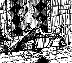 Tystnaden bryts först efter en halvtimme. Det är väpnare John som upphäver en djup, snyftande suck: -”Det är jag som är fröet till denna tvist. Jag är baronens bastard, den olyckliga frukten av föreningen mellan baronen och en enkel tvätterska för fjoderton år sedan. Kettil använder mig för att vända baronen och hans hustru mot varandra.” -”Fjoderton. Gossen har ett gott ordförråd.” Säger Monodur och tuggar på en korv han stoppade på sig i köket. -”Och ett välutvecklat sinne för drama.” Konstaterar Polymoll medan han tänder sin pipa.