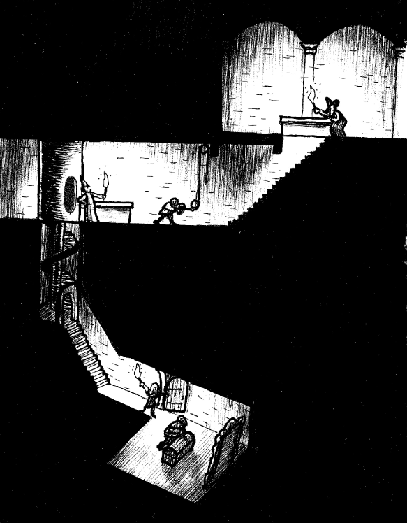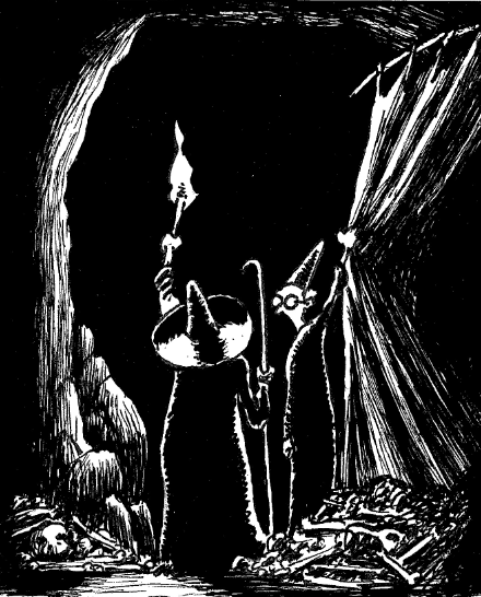 För att göra en lång historia kort: De begav sig iväg, de överraskades av lyktgubbar, de kom fram till – och nedsteg i – trollkarlarnas grav. De stred mot skelett, spöken och reptilmän. Efter många mödor stod de nere i själva gravkammaren. I äventyret beskrivs den som: ”Ett stort fyrkantigt rum, med dörren placerad en bit ut i korridoren. Mitt i rummet står en stor träkista, på motsatta väggen en stor hallspegel.” De fyra äventyrarna hade slagit och hackat sig igenom skelett, spöken, mumier och reptilmän utan ett ögonblicks tvekan, men denna spegel oroade dem mycket. Vad gjorde en stor hallspegel långt nere under jord, i detta i övrigt nästan tomma rum? Den hänger på väggen motsatt kistan – det måste finnas ett samband mellan kista och spegel. Var det en port in till den verkliga skatten? Eller kanske en port ur vilken skattens väktare skulle komma stormande om man försökte öppna kistan? Äventyrarna undersökte spegeln försiktigt men noggrant. De kröp runt och kikade in under och bakom den, de nagelfor den utsirade ramen efter magiska symboler, de letade efter dolda utlösningsmekanismer men fann inga tecken på varken fällor eller magi. Detta gjorde bara saken värre. Att det, trots den noggranna genomsökningen, inte stod några spår av fällor eller magi att finna måste betyda att den som riggat fällan varit extra noggrann med att dölja spåren. Denna infernaliska installation; ”Kista med spegel, av Okänd”, måste ha satts upp av en synnerligen skicklig och särskilt djävulsk yrkesman. Vem vid sina sinnens fulla bruk skulle genom trånga gångar släpa en stor utsirad spegel tre våningar ner under marken? Här måste finnas en fälla av något slag! Efter att många planer gjorts upp och förkastats enas man till slut om att dvärgen Kvitzak Doom med sin dubbelyxa ska slå sönder spegeln, medan alvmagikern Zilvander står redo med eldklot och antimagi. Stigmannen Bolfert Stomp står redo med en pil på bågen medan halvlängdsmannatjuven Svarte Folke hukar bakom kistan. Med en rysning rullas tärningarna, slaget faller och spegeln går i tusen bitar. Blundande och hukande frågar en av spelarna: -”Händer det något?” –”Sju års olycka.” Svarar spelledaren. Suckar av lättnad från spelarna. Därefter lyfter de kistan – och utlöser fällan. Ett stenblock faller ner och blockerar utgången, vatten forsar in och fyller kammaren. I det snabbt stigande vattnet kämpar de med stenblocket tills de med sista tärningsslaget innan de dränks lyckas få loss blocket och utrymma skattkammaren.