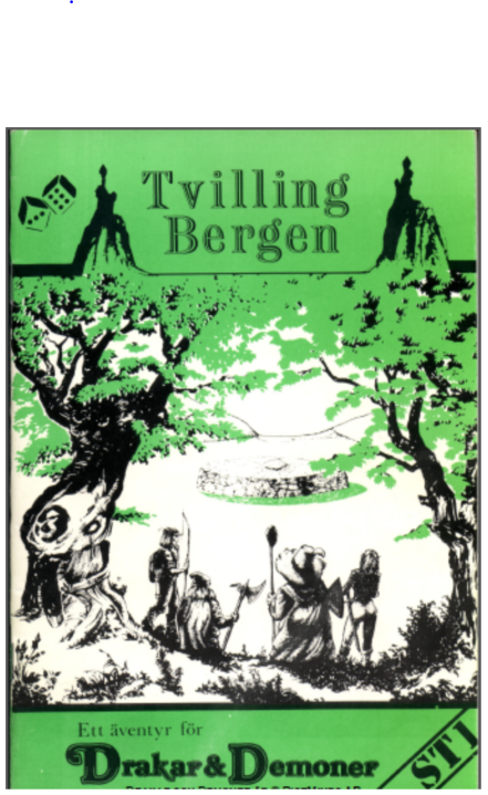 Spelledarens information: Det första äventyr jag testade att spela solo (2013) var ”Tvillingbergen” till Drakar och demoner. Jag fick detta äventyr i trettonårspresent, i maj 1984. Det var en gåva från en kompis i klassen. Egentligen fick vi inte ta med leksaker till skolan, eller ge varandra födelsedagspresenter på skolans område, men min kompis hade just flyttat till Sverige efter att ha vuxit upp i USA så han hade inte riktig koll på regelverket. Det var min födelsedag, jag minns att det var en solig morgon och jag, han och ett par andra killar i klassen smög iväg till ett mindre frekventerat hörn av skolan och öppnade presenten. Jag hade börjat spela rollspel i februari det året och detta var det tredje äventyret jag kom i kontakt med (efter ”Bland alfer och troll” som följde med regelboken i 1982-års utgåva, samt ”Spindelkonungens pyramid”). Jag minns att jag läste äventyret, men jag kan inte minnas att vi någonsin spelade det. Det är verkligen ett äventyr från de svenska rollspelens barndom. Kartorna är ritade med linjal, tunna svarta streck på vit botten. Det finns inte heller något rutsystem som stöd för att se vilken rollperson som står var etc.