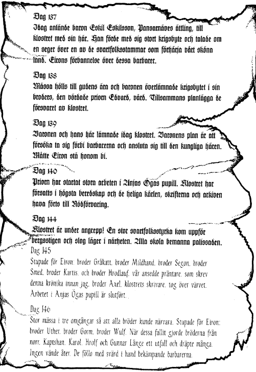 Manuskriptet berättade historien om Karlsklostrets grundande och fall. Om hur klostret byggdes för 77 år sedan vid sjön Anja, på ätten Pansarnäves domäner, och hur det bara 17 år senare intogs och brändes av en inträngande svartfolksarmé. Veckorna före klostrets fall utkämpade baron Eskil Eskilsson Pansarnäve och hans styrkor omfattande försvarsstrider i trakten av klostret. De lyckades överraska och krossa en av orchstammarna i svartfolkshären. Stammens samlade krigsbyte föll i baronens händer och han lät föra bytet till klostret där han trodde det skulle vara i säkert förvar. Men klostret intogs, varvid priorn lät vattenfylla källarvalven för att förhindra att klostrets skatter och reliker föll i svartfolkens händer. Kungens styrkor återtog senare området men klostret återuppbyggdes aldrig. Alla dessa uppgifter är nog så intressanta för den historiskt lagde, men ännu mer intressant för de bägge pekuniärt pressade studenterna var att dokumentet talade om ett rikt krigsbyte som baronen tog – svartfolkens samlade plundringsskatt. På det årets 137:e dag bars denna skatt ned i templet för att skyddas från de andra svartfolkshärarna i trakten. Manuskriptet nämner, varken före eller efter dag 148 samma år, då templet lades under vatten, någonting om att skatten åter fördes ut ur templets valv.