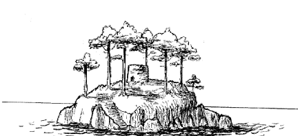 Vid middagstid har solen stigit så högt att den lyser upp sjöns stilla vatten och ön i sjöns mitt. Stolta furor reser sig från den klippiga ön, det går att se en rund byggnad i ljus sten mellan stammarna. Medan äventyrarna paddlar ut mot ön faller solstrålarna rakt på den lilla byggnaden vars ljusa kalkstensväggar fläckvis skuggas av furornas kronor och stammar. När de närmar sig ser de att trappsteg är uthuggna direkt ur klippan nere vid vattenkanten, vilket gör det lätt att ta sig upp på ön. De följer trappstegen upp mot öns högsta punkt. Byggnaden är en sorts lågt, fönsterlöst torn med en port mot väster.