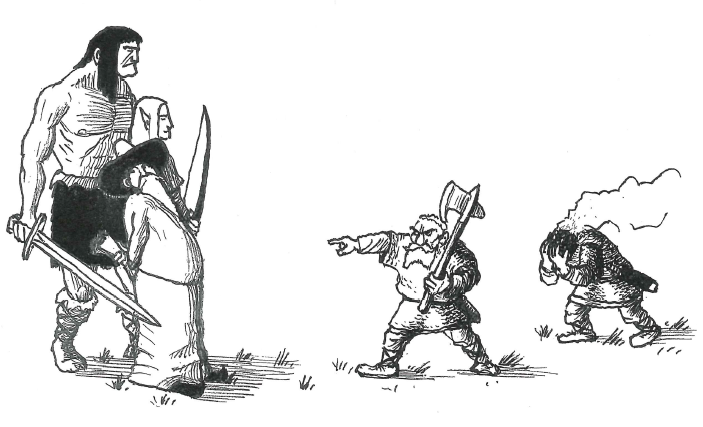 Efter att ha genomsökt de båda döda dvärgarna utan att finna annat av värde än de fjällbrynjor och yxor de bar, vänder äventyrarna åter uppmärksamheten mot vinschen och fällgallret. Grombur, på dvärgars vis intresserad av mekanik, undersöker noga vinschen. –”Det finns ett litet vridhandtag under själva vinschhandtaget. Det kan ställas i två lägen och har troligen inverkan på den stora vinschen, men här finns inga ledtrådar till hur vi borde ställa det. Några förslag?” Efter en kort stunds tyst övervägande säger Botulw: -”Nej.” Efter ytterligare en stunds övervägande säger Eliana: -”Vi singlar slant: Blir det spira låter vi vridhandtaget vara, men blir det sköld så vrider vi på det!” De singlar ett silvermynt och spiran kommer upp. Med ett fast grepp vrider Grombur på vinschen utan att röra det undre vridhandtaget. Han får ta i så han nästan spricker, mekanismen har inte använts sedan graven byggdes. Det rasslar och gnisslar, men ljuden kommer inte från fällgallret …utan från väggen bakom dem!